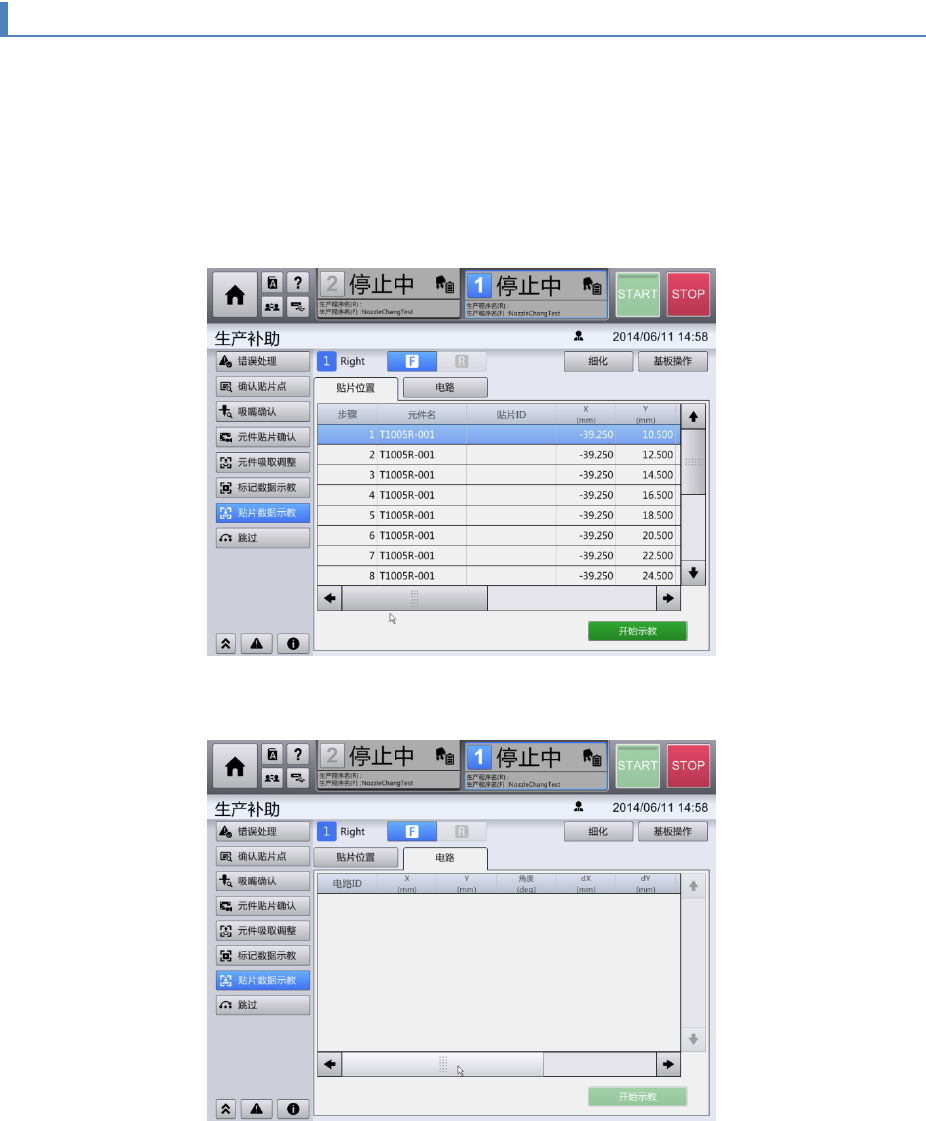 在顶部菜单中按照[生产补助] - [贴片数据示教]的顺序触摸,即显示贴片数据示教画面。