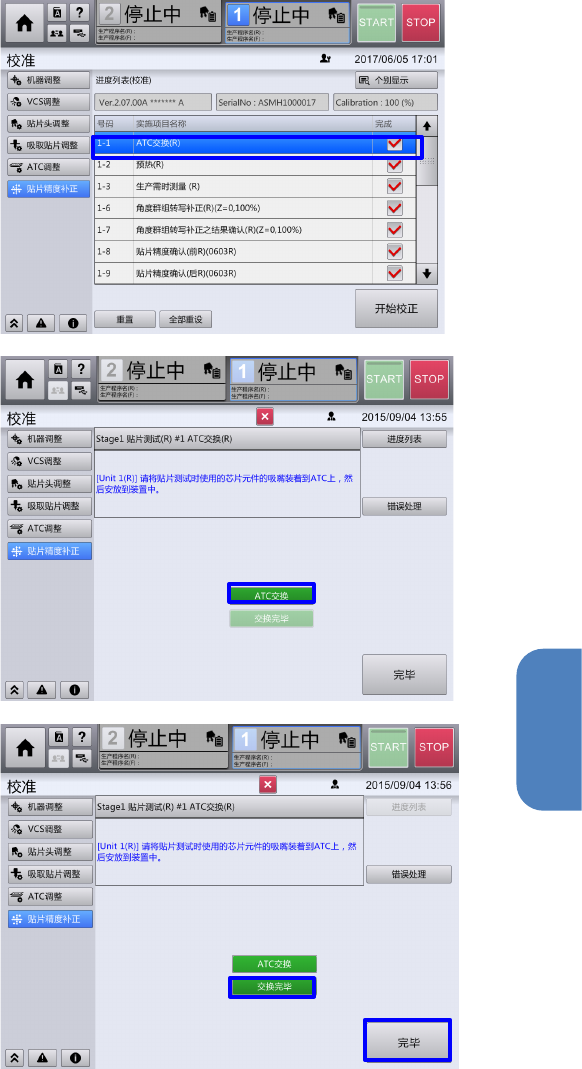 第 4 章 操作 篇 4- 16. 校准 419 4 3 、准备吸嘴 3-1 、选择 ATC 交换 (R) 选择『 AT C 交换 ( R) 』,然后 选择『个别显 示』。 3-2 、执行 ATC 交换 (R) 选择『 AT C 交 换』。 用自动搬送幅度 被调整,供料 器台架掉下, 安全盖子的锁被 解除。 3-3 、吸嘴的安放 打开安全罩,拆 下 AT C ,安放精度补正时使 用的吸嘴。 安放完成后,将 AT C 放回规 定的位置,关…
