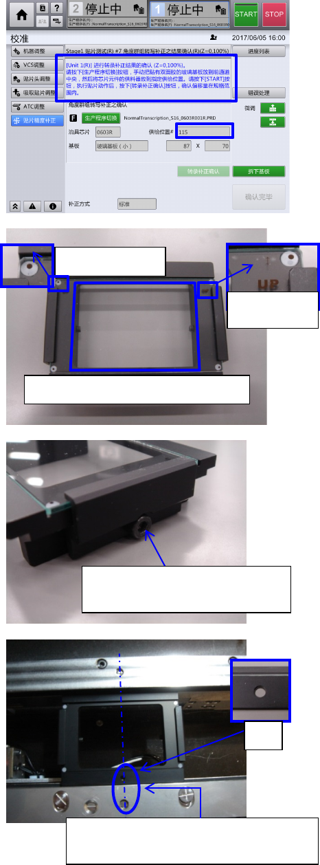 第 4 章 操作 篇 4- 16. 校准 422 5-3 、准备补正时 必要的材料 请将贴有双 面胶带的 玻璃基板,以及 安放了 KOA 公 司制造的方 形芯片电阻 0603R 的供料 器,按照画面指 示安放到装置 上。 ◎ 准备玻璃基板 时的注意要点 请以右侧图像 为参考,准备 玻璃基板。 (请注意以下的 项目。) ● 玻璃基板安放 面不要有异物。 ● 使玻璃基板标有的『 UP 』字符朝上,进 行固定。 ● 玻璃基板要靠 近近前。 ●…