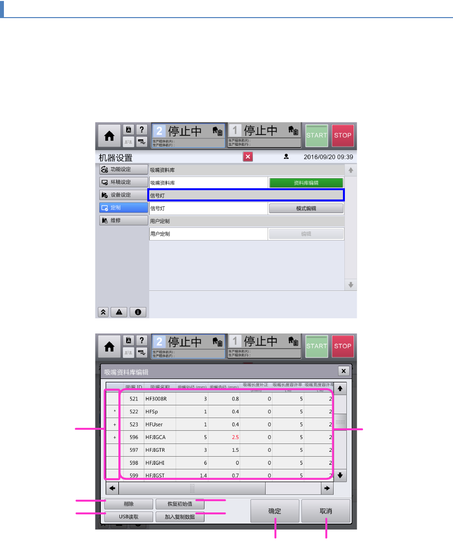 要进行吸嘴资料库的编辑时可在 [机器设置] - [定制] 画面上触摸 [资料库编辑]按钮 。出现[吸嘴资料库编