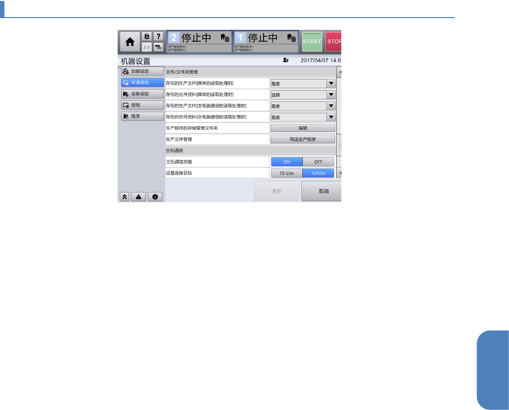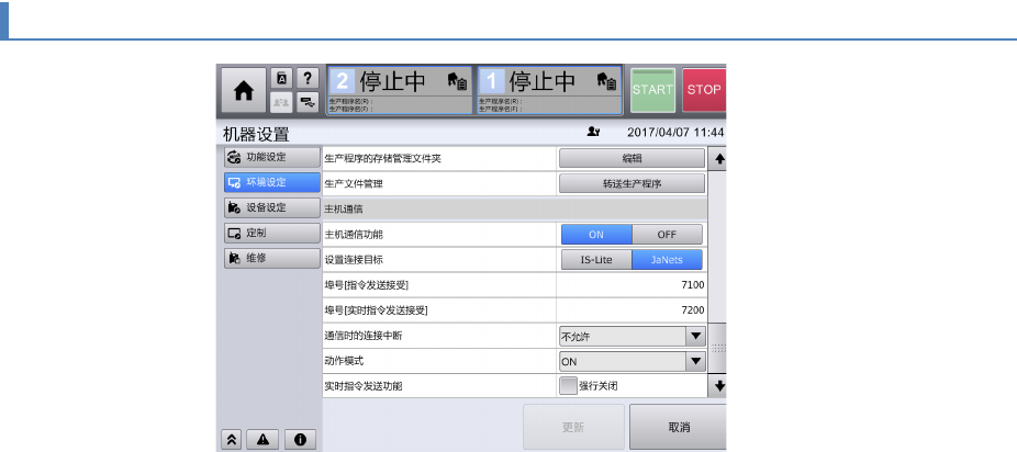第 4 章 操作 篇 4- 17. 机器设置 464 4- 17 - 26. 主机通信 主机通信功能 设定为 ON 时,使用主机 通信功能。 变更设定后,必 须重新启动装 置。 ( 初始值 : OFF) 。 认 接 认 的 认 定 设定主机通信功 能的连接处。 「 IS - Lite 」:连接 IS - Lite 「 JaN e ts 」:连接 J aNets 变更设定,则需 要重新启动 RX - 7 。 ( 初始值: IS -…