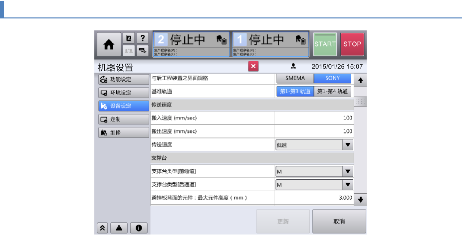 「单轨通道」: 切换为使用 L 尺寸的支撑台,处理大型基板的单通道模式。