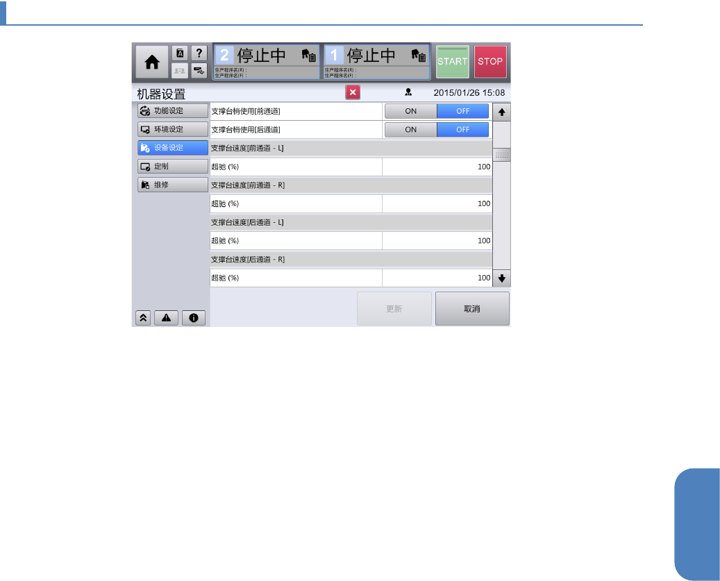 选择 ON 时,在前侧通道决定基板位置时的支撑台的支撑动作将会切换为使用支撑台销(梢)的模式。