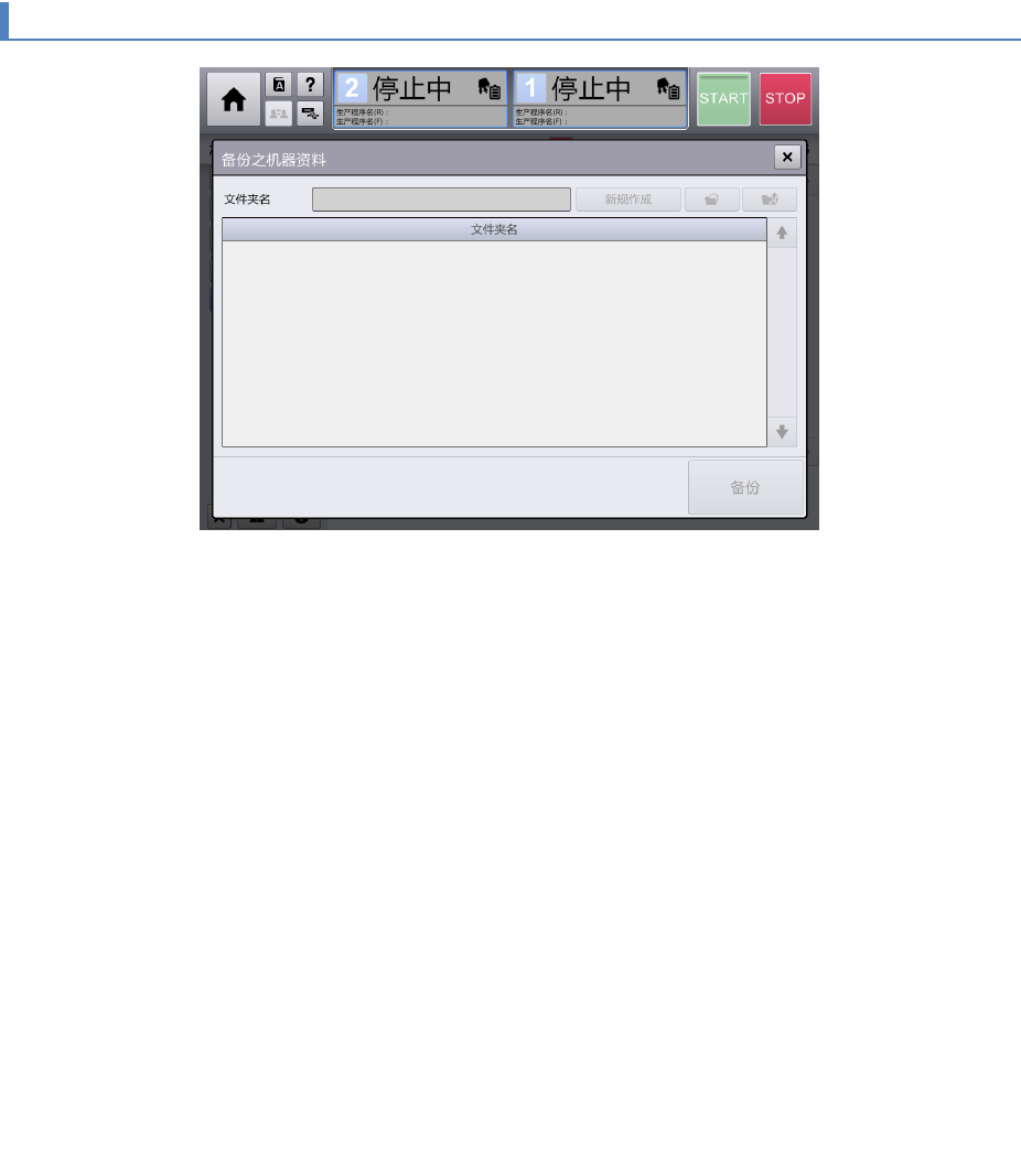 第 4 章 操作 篇 4- 17. 机器设置 496 4- 17 - 56. 备份之机器资料 (备份机 器资料) 文件夹名 为了保存机器资 料,需要从 USB 存储 器内的文件夹名列表 中选择,使文件夹名 显示在文本区域里。 新规作成(新建) 在 [ 文件夹名 ] 的文本区域里编辑新的 文件夹名,触 摸 [ 新规作成 ] 按钮后,即可 新建该文件夹。 打开文件夹 打开在列表中选 择的文件夹, 显示该文件夹内的层 级。 关…