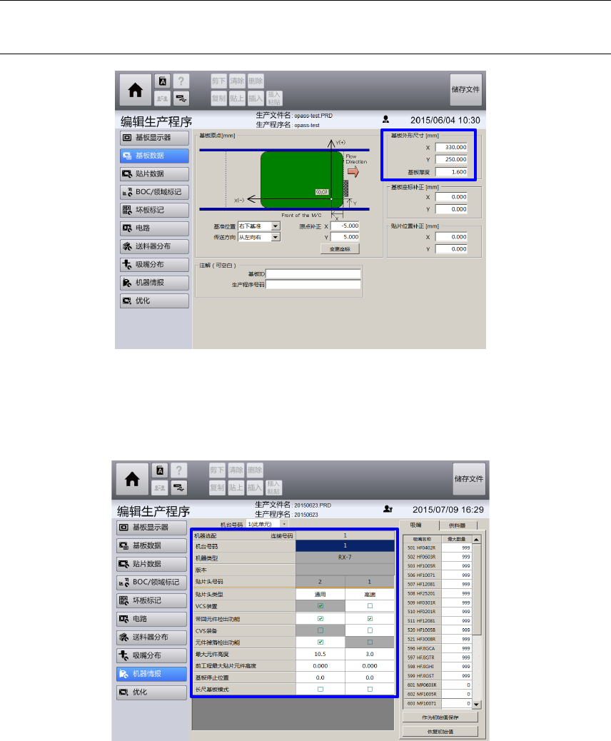 在[编辑生产程序] – [贴片数据] 画面、[编辑生产程序] – [BOC/领域标记] 画面、[编辑生产程序] – [坏板标