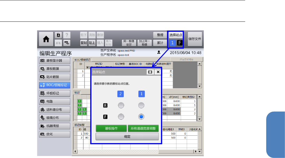 第 4 章 操作 篇 4- 18. 识别 镀锡印刷补偿贴片 位置功能(选购项) 511 4 (3) 选择要设置基板 的 站点 在 [ 编辑生产程 序 ] – [ 贴片数据 ] 画面、 [ 编辑生产 程序 ] – [BOC/ 领域 标记 ] 画面、 [ 编辑生产程 序 ] – [ 坏板标 记 ] 画面中,会 显示画面右上部的共 通面板中的 [ 选择站点 ] 按钮 ,在其下部会显示当前 选择 的 站点 位置 (左 起为装置编号 [1]/[2…