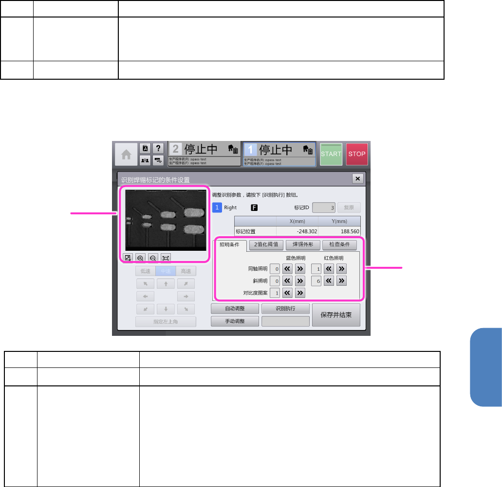 第 4 章 操作 篇 4- 18. 识别 镀锡印刷补偿贴片 位置功能(选购项) 522 请一边观察 O CC 监视器,一 边调整 [ 同轴照明 ] 、 [ 斜照明 ] 、 [ 对比度图 案 ] 的各参数,使焊锡 印刷与基 板具有较好的对 比度。 在编辑框中直接 输入 数值 ,或选择编辑框右 侧的 按钮 对各参数 进行 变更。 同轴照明主要影 响基板上的 垫片 ( 焊盘 Pad) 或 阻焊部分的亮度, 斜照明主要影 响焊锡的亮度。 ・ 焊…