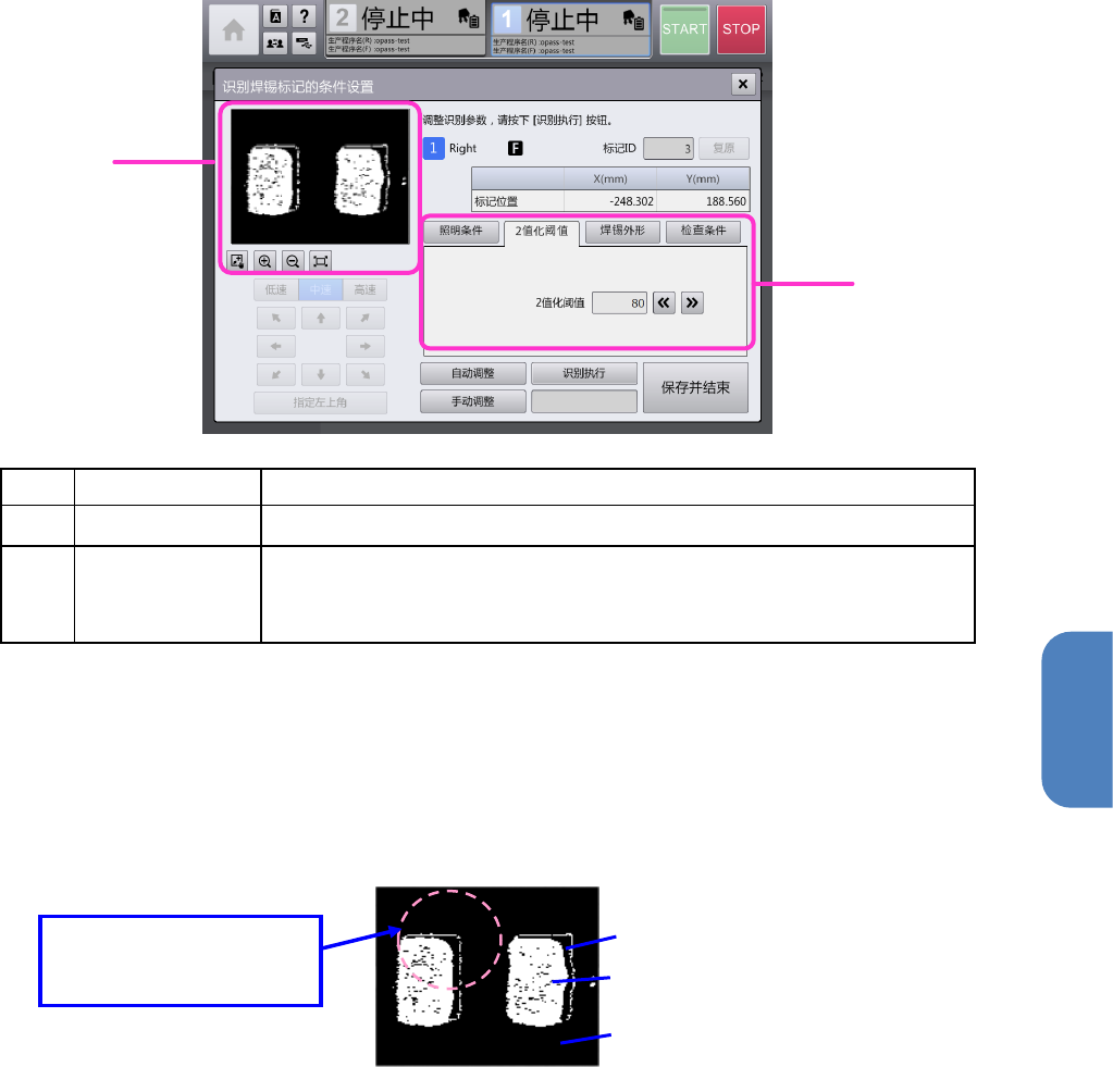 调整完成后,请选择[2 值化阈值] 选项卡。调整值即会更新,并进入下一工程。