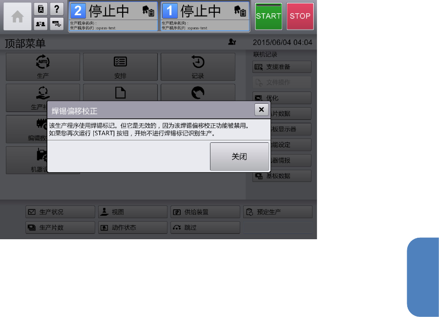 态下,载入使用焊锡识别的生产程序,按下 [START] 按钮后,在自动生产开始前会显示以下的警告提示