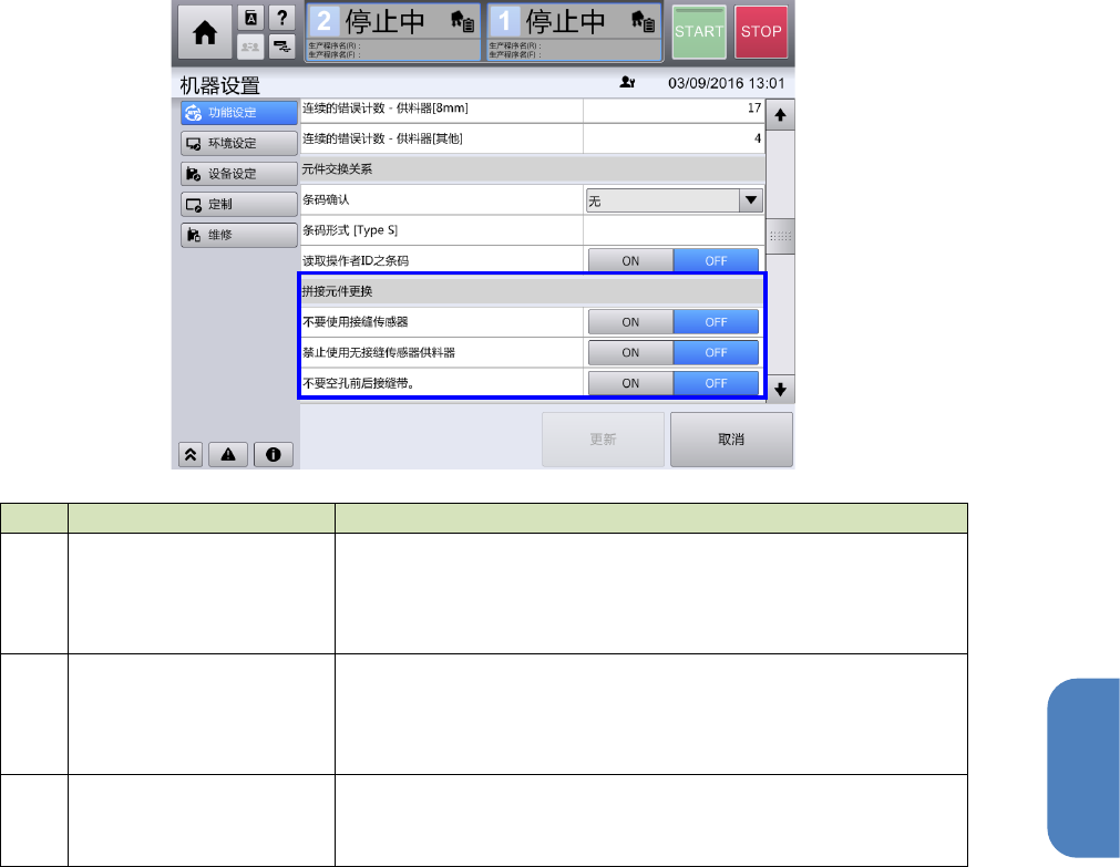 不要使用接缝传感器 选择功能 ON/OFF,该功能为在整体装置中不使用接缝传感