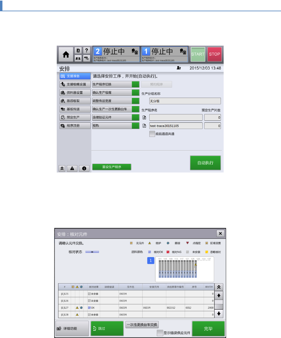 侧的[安排:核对元件] 对话框。单元 1 及单元 2 的供料器核对完成后,将进入下一个准备工程。所有