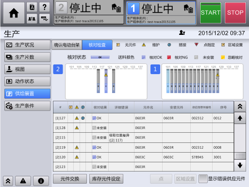 安装供料器的位置与生产程序的设定如有不同,将显示警告。在[供给装置] 画面中,对象供给位置的详细