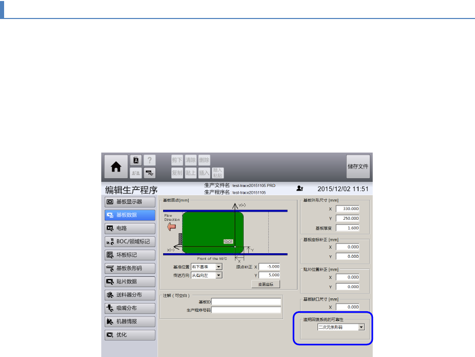 (2) 在[编辑生产程序] – [基板数据] 画面中, 作为[追溯] 的项目,要选择[2 次元条形码(OCC)]。若选择