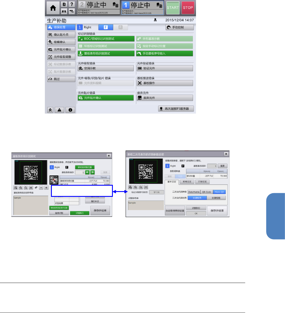 第 4 章 操作 篇 4- 19. IFS - NX 的 使用(选项) 569 4 (6) 触摸 [ 错误 处理 ] 画面的 [ 基板条形码识别 测试 ] 按钮 ,即显示 [ 基板条 形码识别测试 ] 对话框 。然后触摸 [ 基板条形码识 别测试 ] 对话框的 [ 基板条形码条件设定 ] 按钮 后,将显示 [ 基板 2 次元条形码识别 条件 设定 ] 对话框,可对发生识别 错误的基板代码调整 识别参数。 (7) 在 [ 基板条形码识别 …