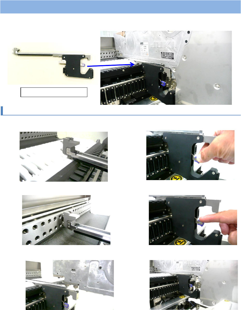 ① 将附件的滑动轨道插入统一更换台车(RF)的通道里,将锁紧释放杆向上提,扳开夹紧。