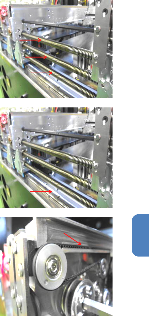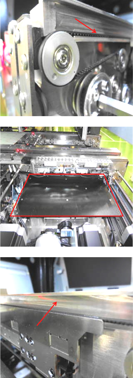 第 5 章 维护 篇 5- 2. 保养检查 27 5 传送部 1 . 梯形螺纹丝杠的清洁及 注油 用毛刷在 3 根丝杠的滑动 部上涂敷壳 牌爱万利 EP2 润滑脂。 注意 过多的润滑脂会附着到 基板或元件 上,引起品质降低,请 务必擦掉。 2 . LM 导轨的清洁及注油 用毛刷在 LM 导轨的轨道面上涂敷壳牌 爱万利 EP2 润滑脂。 3 . 传送皮带的清洁 用回丝干擦,去掉附着 在皮带上的脏 污。