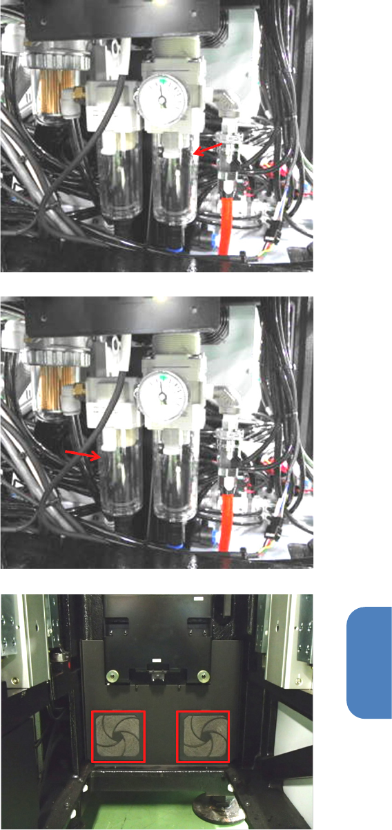 第 5 章 维护 篇 5- 2. 保养检查 35 5 1-3 .当有泄液积留时 ,请向左旋转泄液阀 将其排出。 使用后 2 年或圧力下降达 0 . 1MP a 前 请更换过滤器滤芯。 2 . 油雾分离器的检查及更 换 * 护罩的拆卸与 1 相同。 当有泄液积留时,请向 左旋转泄液阀 将其排出。 使用后 2 年或圧力下降达 0.1MPa 前 请更换过滤器滤芯。 3 . 空气过滤器的清洁 检查位于台車插入部里 面的吸气风扇 的过滤器。 过滤…