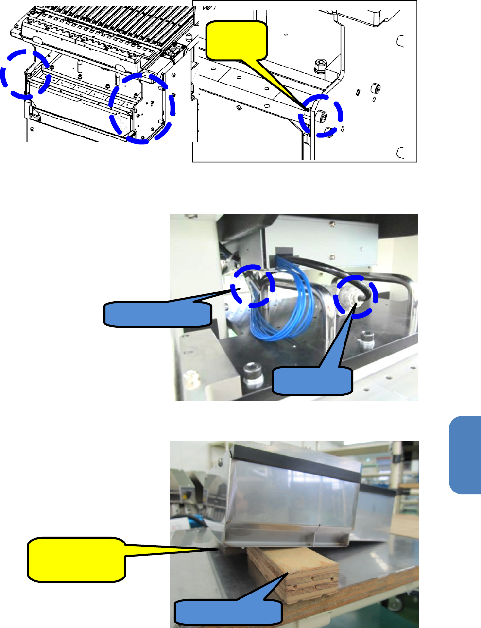 第 5 章 维护 篇 5- 2. 保养检查 48 台架部 切带器单元的 清扫 <注意事项> ・ 操作 切带器 单元 时,请注意带上 手套以免受伤 。 ・ 台车已安装到贴片机 ,需要解除该安装时, 必须通过 画面操作 使台车 下降 。 使用阀开关手动下降时,切带器处于打开状态,非常危险。 ・ 如果拆下的切带器单 元的刀刃是打开状态, 则请在该状态下进行 重新安装,操作 贴片机, 使台车 上下 运动 。 1 .按照右图,从侧面拆 下固定 的…