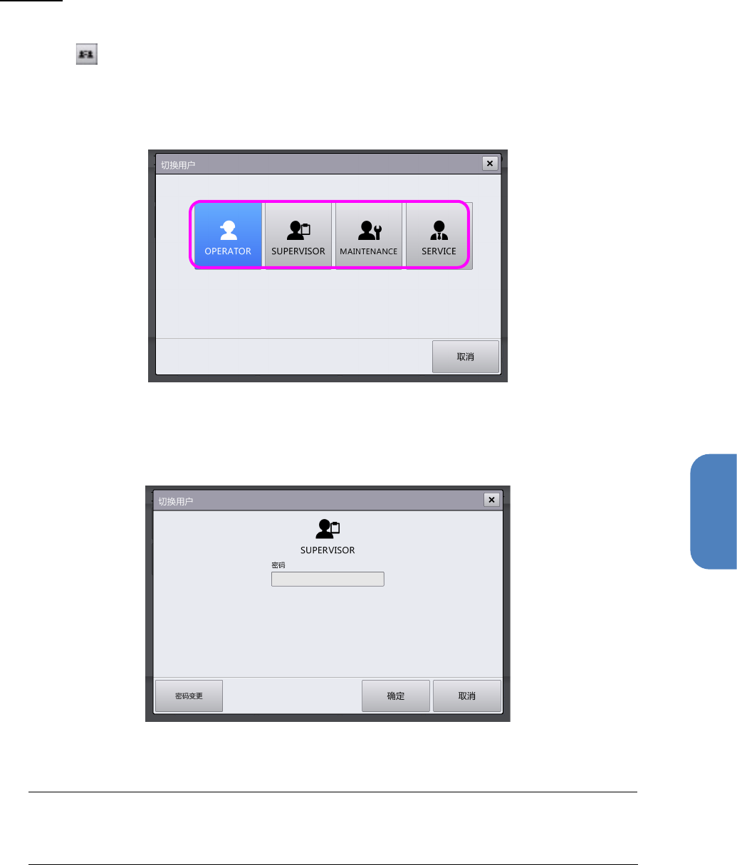 使用软键盘输入密码,触摸[确定]。切换用户完成,返回顶部菜单。软键盘的使用方法,请参见
