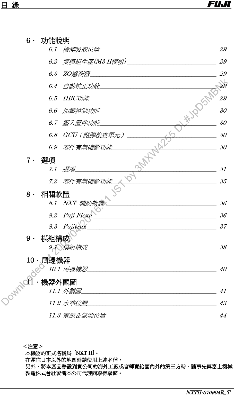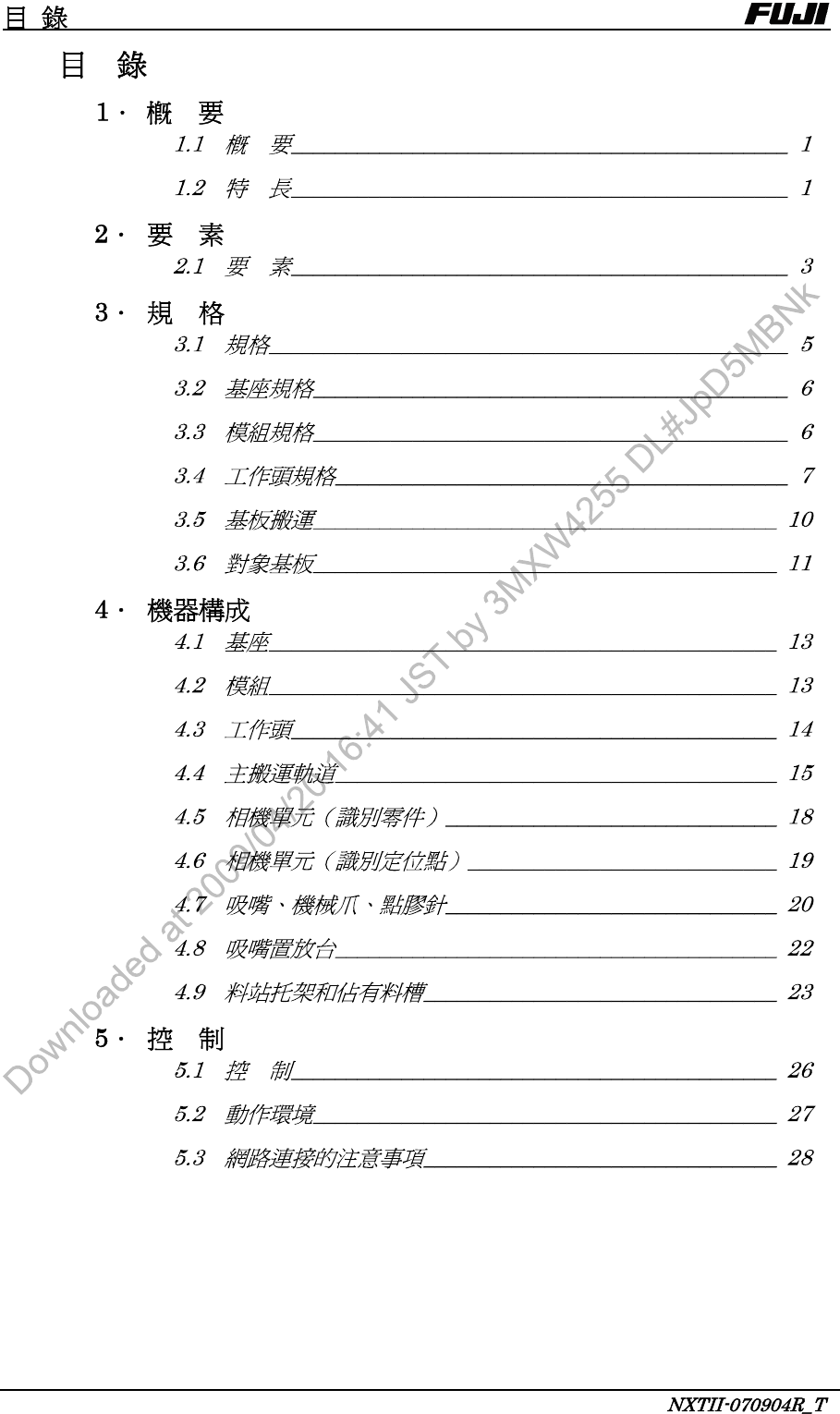※本規格說明書因產品改進,有不經預告就變更的可能。 ※本規格說明書內的 部分均為現在正在研發的內容。 標準規格書 No. CNT -NXT II-07T 富士機械製造株式會社 初版 2008 年 2 月 改訂 2009 年 4 月