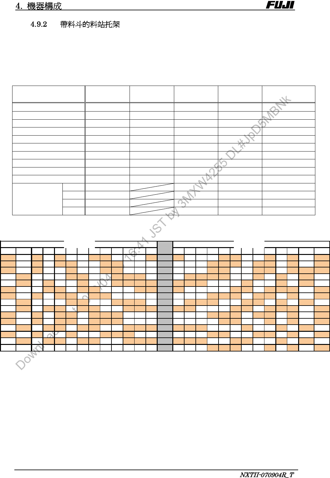 - 24 - 作為選項, W8 1 3" 料卷可以按 1 間距搭載,也可以選擇帶料 斗料站托架。 將供料器附屬的料卷托架拆除後, 取而代之將帶料斗的料站托架安 裝在機器上。 料站托架的更換台車 (PCU) ,必須使用帶料斗的料站托架 專用的台車。 在帶料斗的料站托架 (M6 I I , M6 IISP) 上搭載 1 個料盤單元 -M 時,必須有專用的 半料斗。 供料器種類 供料器 佔有料槽數 料斗 佔有料槽數 M3 I…