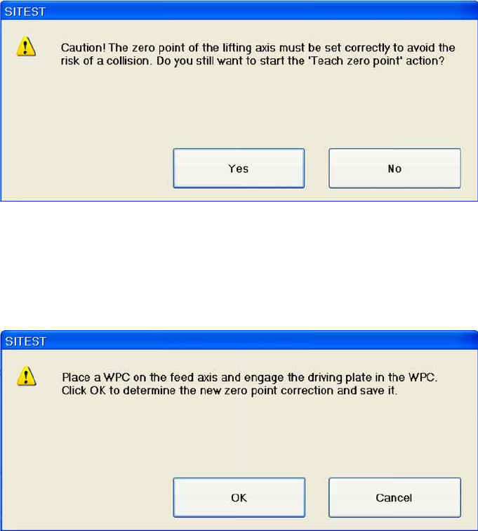 Teach zero point... Opens a dialog box with a warning. Acknowledge this with