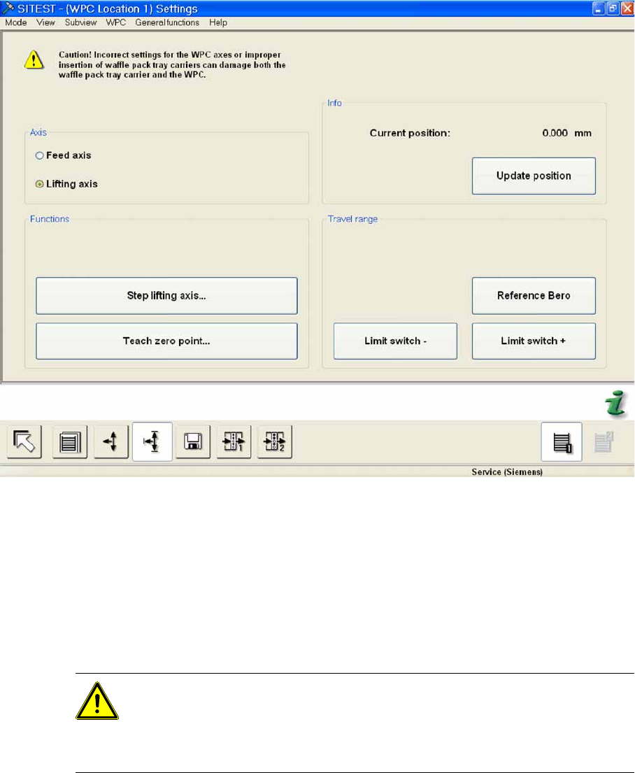 Step lifting axis... Opens a dialog box with a warning. Acknowledge this with