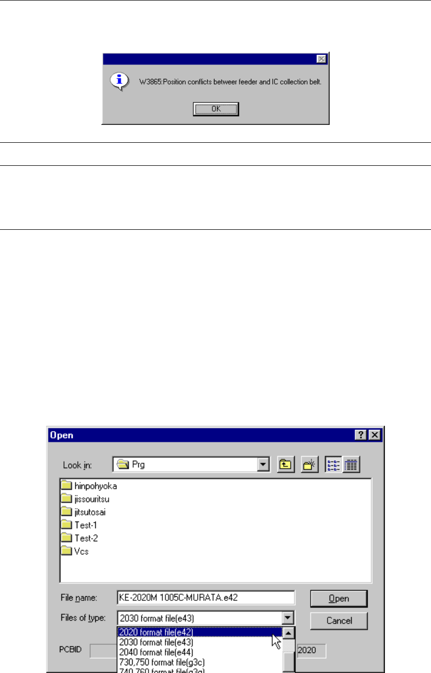4 − 9 Note: When reading a file, the machine checks to see if a position specified in Pick data is overlapped with the IC collection belt position. If the machine detects any overlap, it displays the w arning message as …