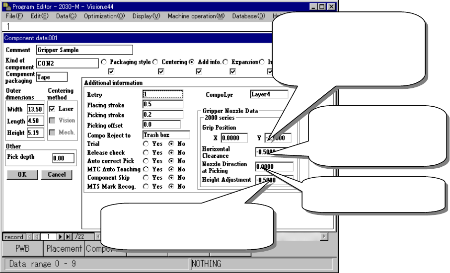 13 − 23 ③ Laser pos. (posit ion) Be caref ul to enter this setting item when you use a gripper nozzle. Normally, enter the distance f rom t he top of a component t o the surf ace on which laser beam impinges in t he “Las…