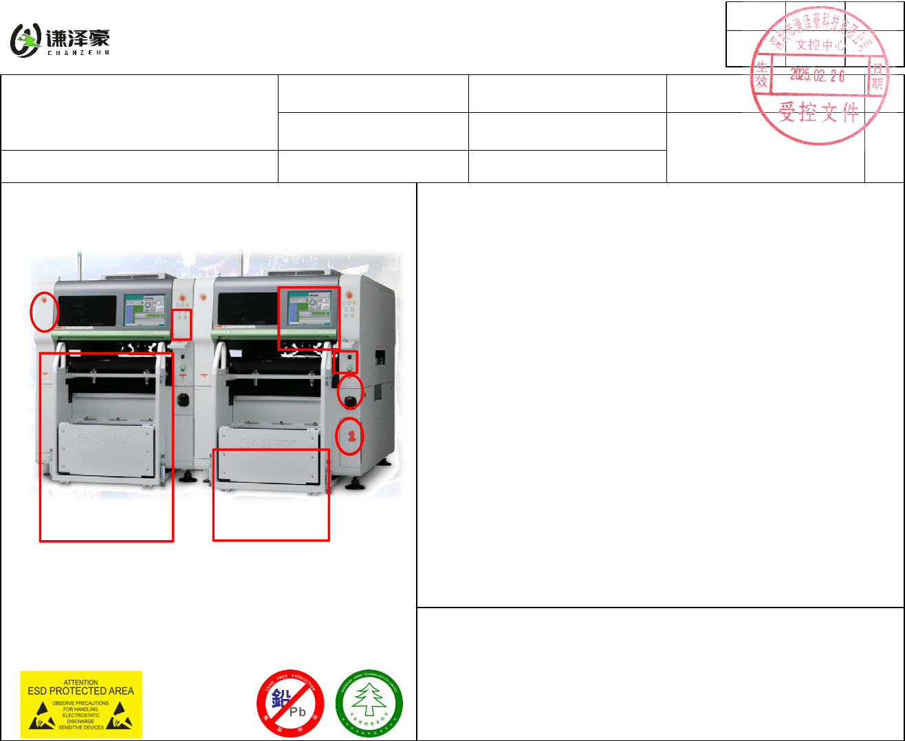 承认 确认 作成 深圳市 谦泽豪 科技有限公司 G200MK3 贴片机作业标准书 产品编号 :共通 文件编号 : 所需工具 页码 产品名称 :共通 制定日期 : 设备 、工治具 :推力计 、竹签 、 油性笔 、镊子 1\1 目的 :使大家 更快学会设备 的开关机流程 工程名: SONY贴片机的开机与关 机 工程顺序 :贴片工 位 图例 : 操作步骤 : 开机流程 : 1、确认电压 为三相 200 ±10V ,气压0.5 ±0.05MPa…