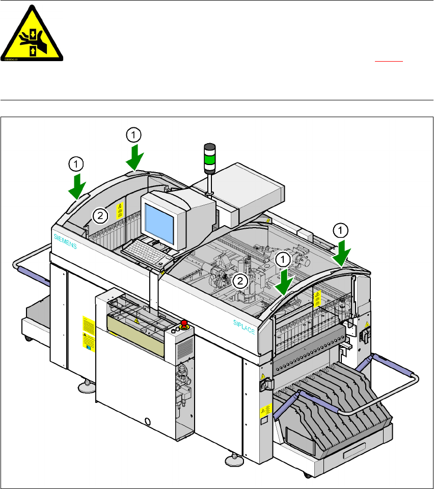 Skötselinstr uktion SIPLACE F5 HM 2 Driftsäkerhet Programvers ion SR.408.xx Utgåva 03/2006 SE 2.4 Säkerhetsfö reskrifter för au tomatens drift 45 2.4.4 Säkerhet sanv isningar för att öppna oc h stänga skyddskåporna För a…