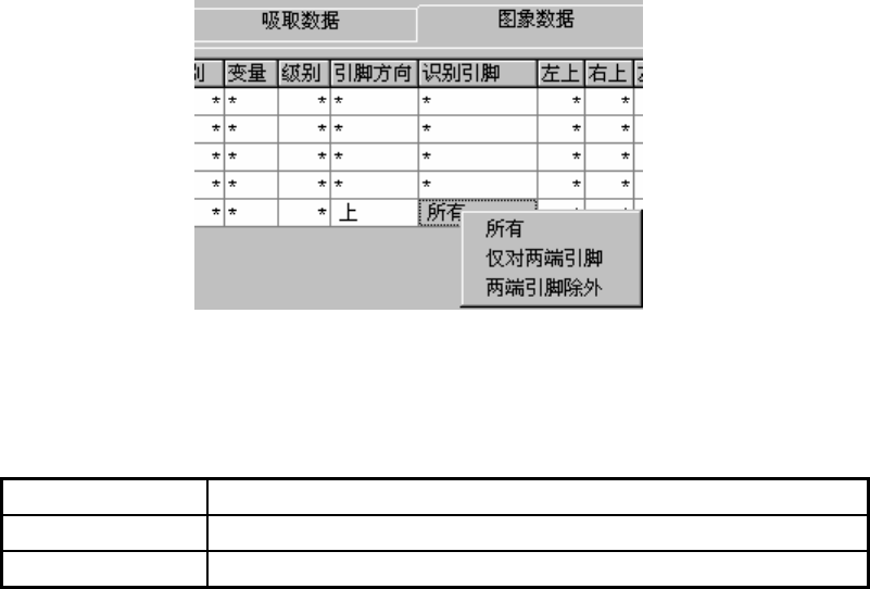 操作手册Ⅱ 2-80 13)引脚方向 元件种类为单向引脚插头时,设置有引脚的面是上还是下。 用<右>击选择。 14)识别引脚(左上、右上、左下、右下) 对插头元件, 通常需要识别所有引脚, 如只能识别两端的引脚,或两端有引脚以外的发光物时 , 只能分别按:“仅对两端引脚”进行识别,或把发光物体假定为引脚,将 “两端引脚除外”进 行识别。 右击,则显示选择项目。 图 2-3-35 在列表画面设置识别引脚 表 2-3-4 识别引…