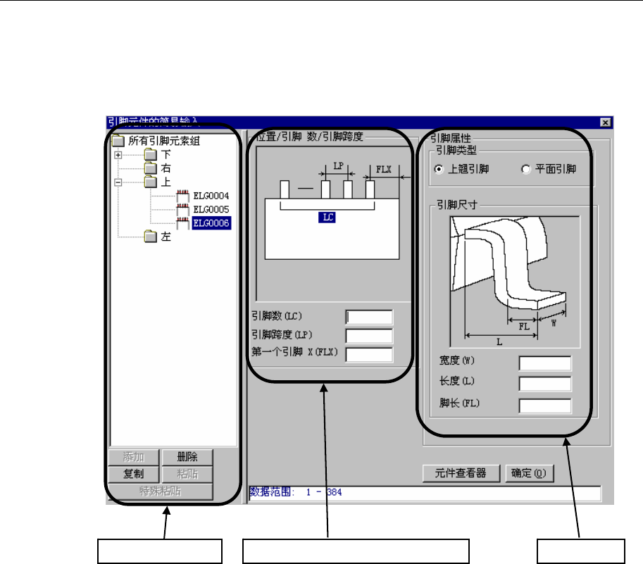 引脚元件简易输入画面由“引脚元件组一览”、“引脚位置、引脚数量、引脚间距”、