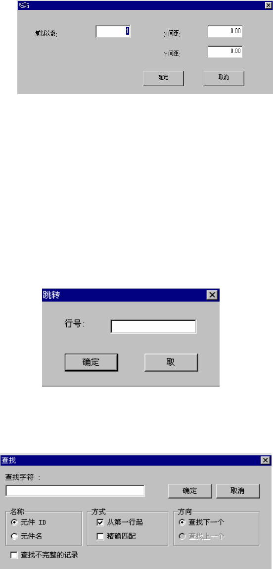 操作手册Ⅱ 2-129 4) 粘贴 粘贴用上述的复制命令选择的范围。 选择粘贴命令后,显示以下画面。 图 2-5-2 粘贴对话框 ①复制次数 :指定复制次数。 ②X 间距 :指定 X 方向的贴片位置的增加部分或减少部分。 ③Y 间距 :指定 Y 方向的贴片位置的增加部分或减少部分。 ④确定 :执行粘贴。 ⑤取消 :中止粘贴。 5 ) 插入行 插入空白行。 6) 复制并插入 将光标所在行复制插入到下一行。 7) 跳过 选择跳转命令后,显示…