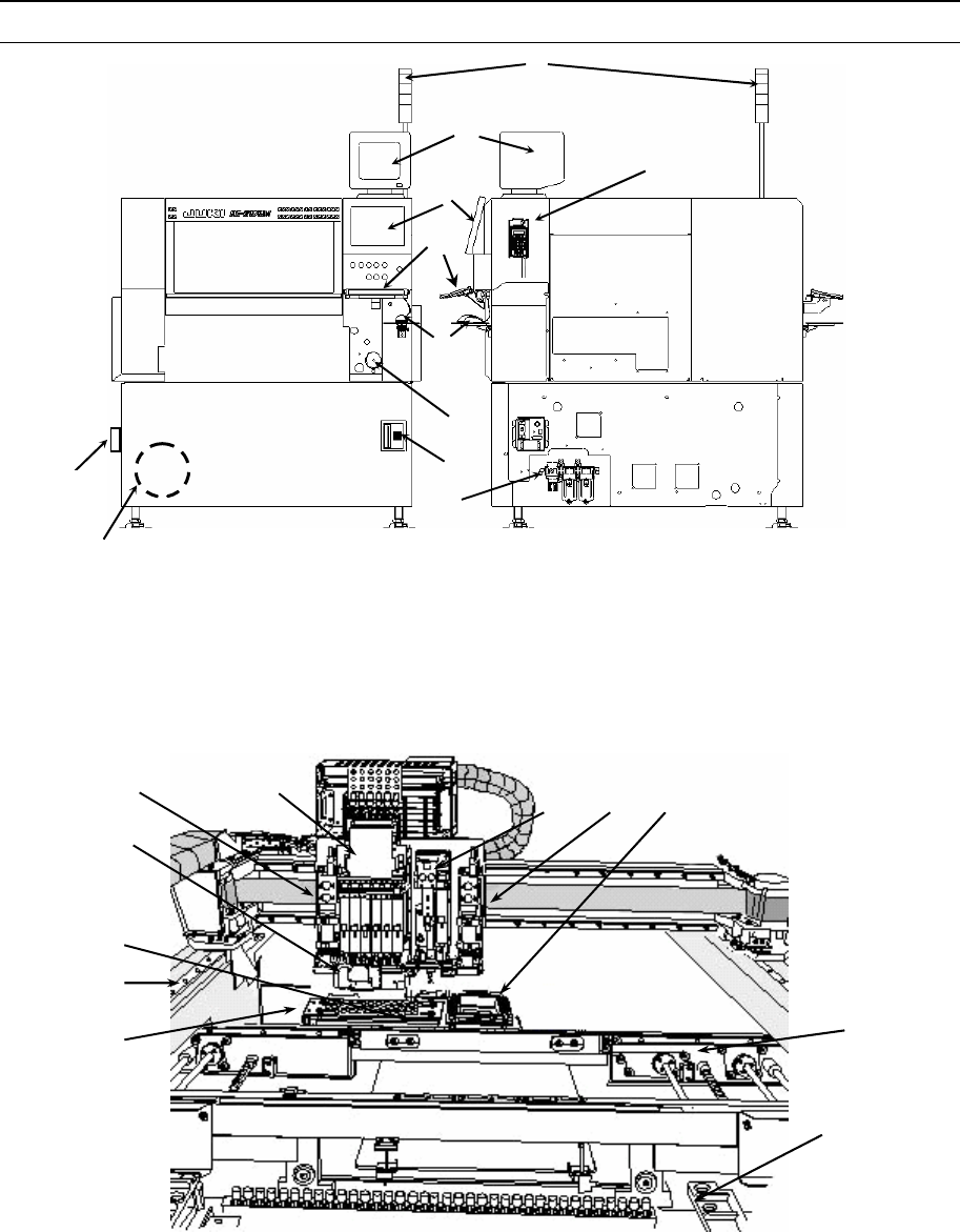 操作手册Ⅱ 1-7 1-4 设备概要 1-4-1 本设备的构成 图 1 -4-1 正面图 图 1-4 -2 右侧面图 图 1 -4-3 ① ATC单元 ④ OCC 单元(R) ( 只限 KE-1080) ⑧ 基板传送单元 ② LNC60贴片头单元 ⑤ OCC 单元(L) ⑨ CAL块单元 ③ IC 贴片头单元(KE1080) ⑥ VCS 单元 ( 只限 KE-1080) ⑩ 送料器台单元 ⑦ X-Y 单元 ⑪ HMS 单元 ① 监视器 …