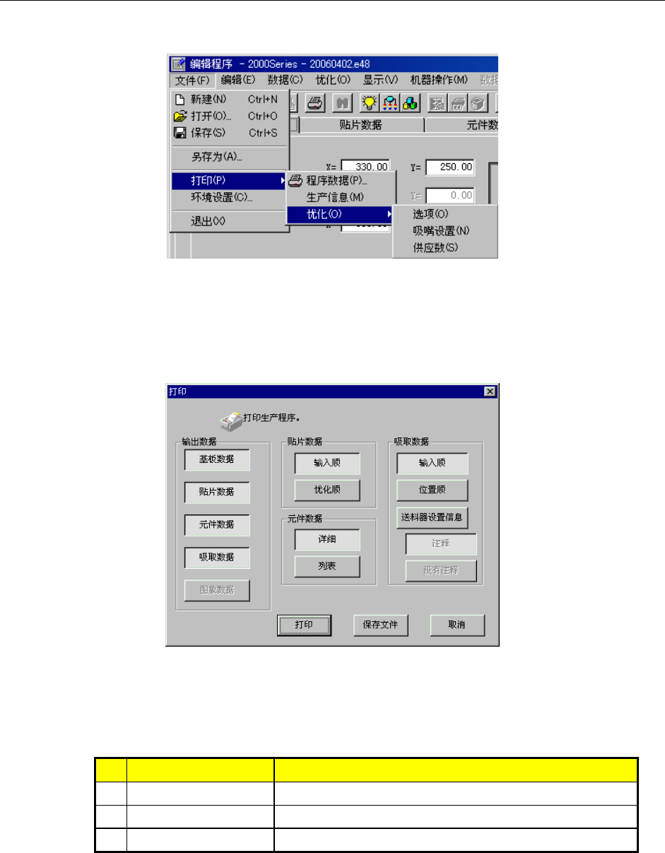 选择“文件”/“打印”,从“程序数据”、“生产信息”、“优化”中选择要打印的项目。