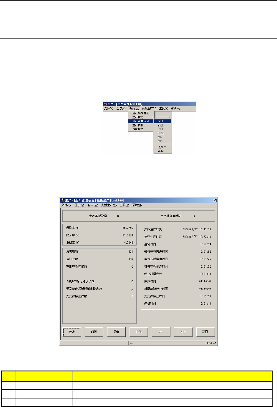 操作手册 II 3-15 4 结束生产时刻 使用该生产程序进行生产、最后结束的日期和时间 。 5 运转时间 从生产开始到退出生产之间, 除去停止时间、 等待基板传送时间的时间总和 。 (不包含临时停止时间) 6 等待基板搬进时间 是指从释放基板、到搬入传感器变为 ON 之间的时间总和。 但释放基板时搬出传送带(搬出缓冲,下同)上有基板时,应视为基板的搬 出等待时间。释放基板时搬出传送带上没有基板、而搬入传感器或等待传感 器已处于 ON …