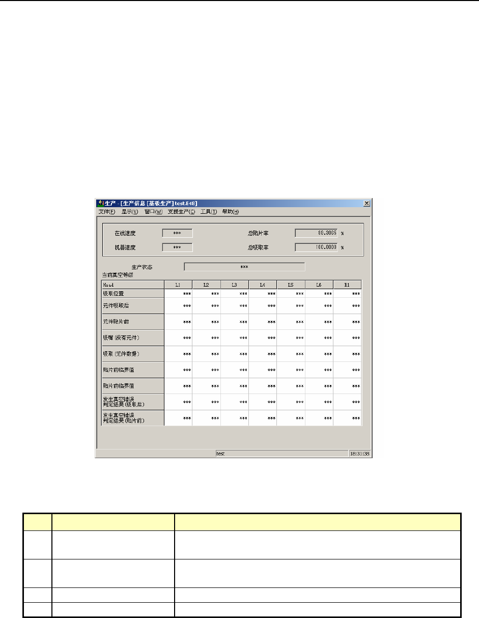 操作手册 II 3-19 3-3-2 生产信息 显示每1张基板的操作节拍、总贴片率、总吸取率、真空值的信息。 1) 生产信息显示条件 ① 当生产模式为基板生产时。 ② 下一次生产时的总贴片率与总 吸取率,将在上次显示的数据基础上累计计算。 需要全新显示时,请清除上一次的生产管理信息。 2) 生产信息显示画面 从菜单栏中单击“窗口”/“生产信息”,显示如下画面。 图 3-3-5 生产信息 3) 生产信息显示项目 No. 项目 内容 1 在…