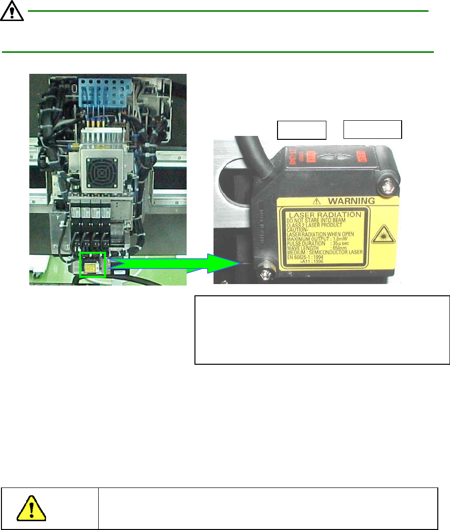 操作手册Ⅱ 1-14 1-4-1-6 HMS HMS(高度测量装置)系统用于测量元件高度、送料器的吸取位置等。 此系统由实际装备在贴片头的高度变化传感器 (传感器部分与功放部分) 和控制此传感器的 HMS 基板构成。 传感器功放部分和基板上的调整旋钮及开关等已在出厂时调整好,请勿调整。 图 1-4-8 HMS ◆HMS 符合 JIS C6802 激 光安全规格 CLASS 2 标准。 请按照本手册指示使用,以便确保安全使用。 高度传感器…