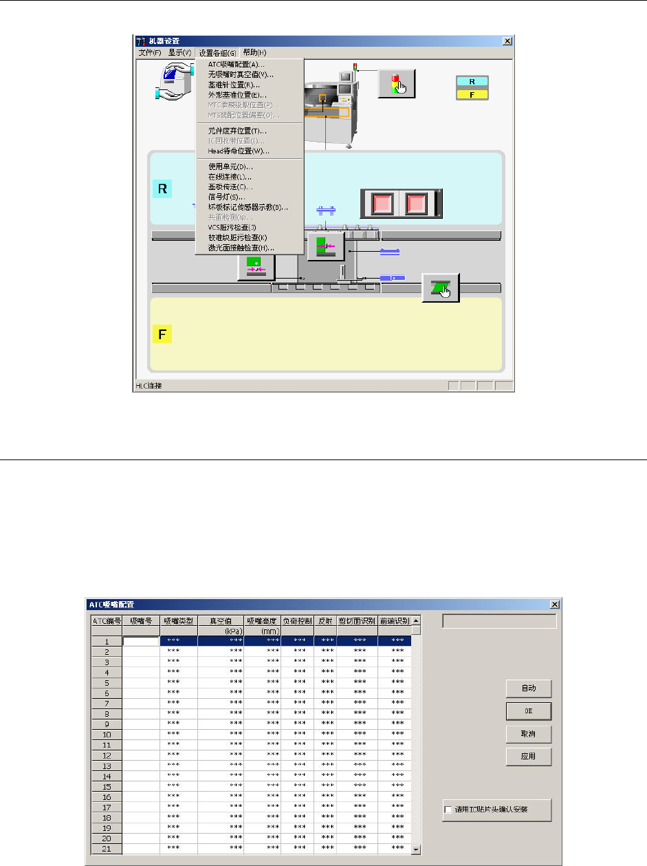 操作手册Ⅱ 4-46 1) 设置方法 基准贴片头安装吸嘴后,用激光来测量吸嘴顶端的高度(反映吸嘴高度)与吸嘴的外形宽度(反 映吸嘴编号),并获得真空值。 ① 个别设置:单击相应的吸嘴编号,按下“F3” 键,即可设置。 按下“DELETE”键或“BACK SPACE”键即可删除。 ② 统一设置:统一自动设置所有的 ATC 编号或已选择的多个 ATC 编号。 <设置步骤> (1) 请点击“自动”按钮。 (2) 显示如下的画面。 …