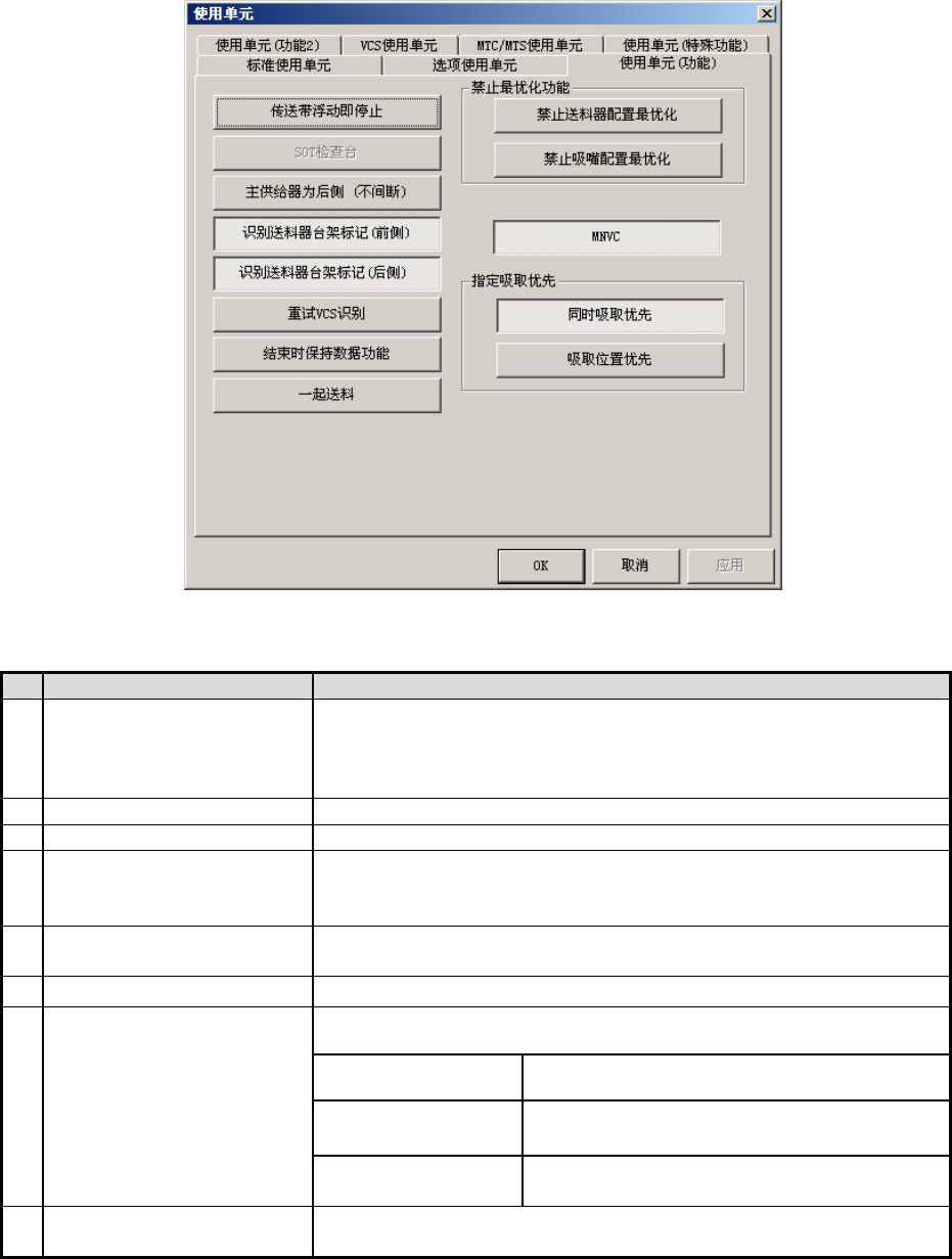 操作手册Ⅱ 4-61 3) 使用单元(功能) 设置“有”/“无” (是否)使用应用软件。 选择“使用单元(功能)”标签后,显示下列“使用单元(功能)设置”画面。 在 MTC/MTS 使用单元中选择了 MTS 时,会显示 “识别送料器台架标记(后侧 MTS) ” 。 图 4-4-17 使用单元(功能)设置画面 〈指定为不使用时的动作〉 No 单元 生产操作 1 传送带浮动立即停止 在 XY 移动中传感器检查出时,XY 速度进入低速运行…