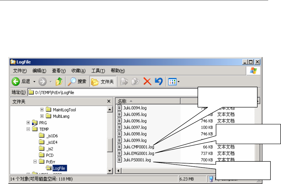 操作手册Ⅱ 4-90 4-7-2-2 取得停机前的生产自动记录 本设备自动保存停机前的 100 张以下的基板生产数量记录文件。 ①保存记录 记录文件自动保存在「D:\Temp\PcErr\LogFi le」文档中,文件名为「Juki.生产数量.log」 。 除「Juki.生产数量.log」文件以外,还生成下列 3 个文件。 ②删除记录 切换生产程序后,以「Juki.0001.log」开始,依序自动覆盖。 此外, 「Juki. CMP00…