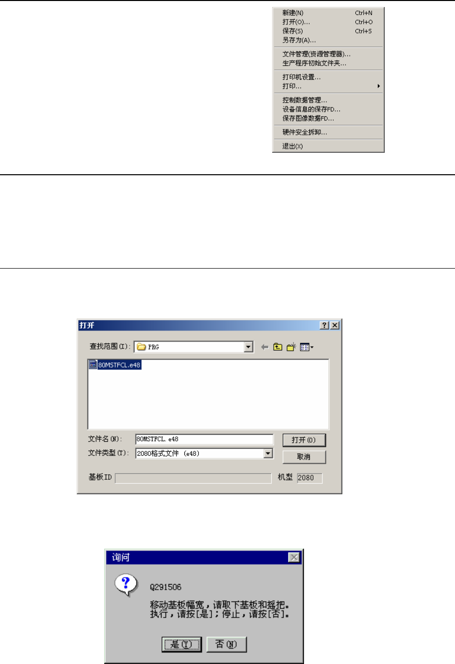 操作手册Ⅱ 1-31 1-7 文件操作 进行生产时,需打开生产程序文件。 本章就桌面画面的文件各操作方法进行说明。 1-7-1 新建 新建文件时,请选择菜单栏中的“文件”/“新建”。 进行生产程序的数据初始化。 如有未保存的生产程序,则显示确认信息。 1-7-2 打开(读入文件) 读入已经制作好的生产程序文件。 从菜单栏中点击“文件”/“打开” ,则显示如下的画面。 选择文件,点击“打开”,读入选中的文件。 配备有自动调整宽度功能(…