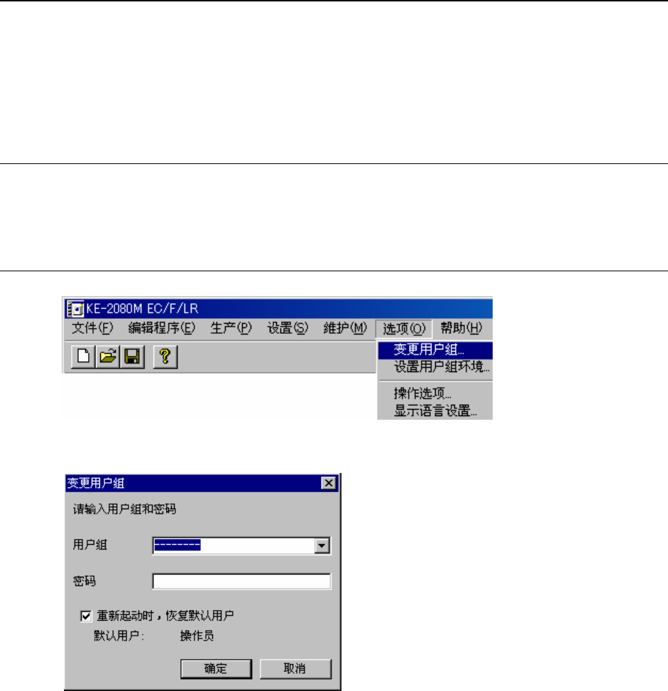用户级别变化时可修改输入的密码,也可设置默认用户(参见2-2-1-1 变更用户组的“重启动