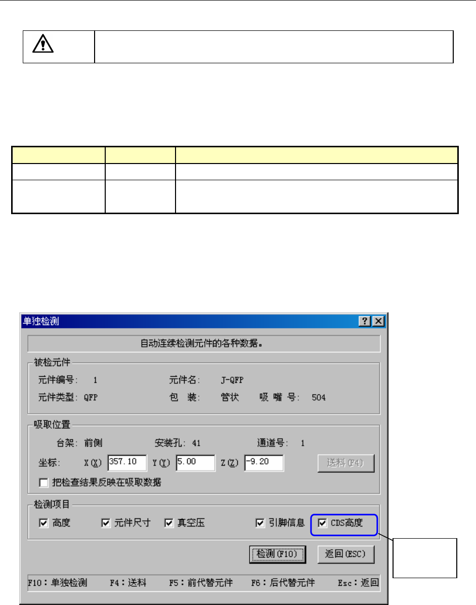 操作手册Ⅱ 2-151 2-5-4-2 测量 本功能为:在贴片头上 安装实际使用的元件,执行测量(检测)后,把 其数据反映到生产程序。 注意 为了避免人身伤害,在机器运行过程中,切勿将手和头伸入装置内部。 2-5-4-2-1 检测模式 有“连续检测”和“单独检测”2种检测模式。可通过菜单选择切换运行模式。 以下为各模式的功能。 表 2-5-4-2-1 检测模式的内容与菜单 检测子菜单 运行模式 运行内容 单独 单独检测 检测元件画面表格…