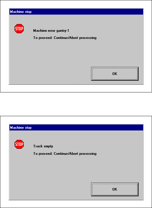 If a track error, machine error or conveyor error occurs, a corresponding information box is shown