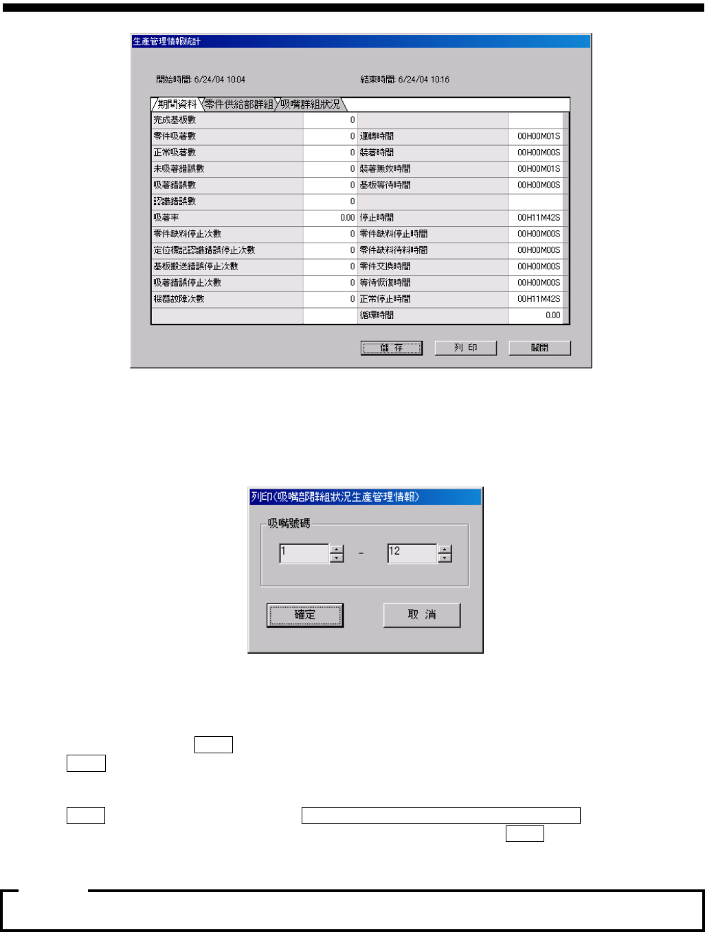 操作篇 4. 自动生产 4-82 SI-F130AI 图 4.7.4- 3 生產管理情 報統計 ( 生产管理 信息统计 ) 对话框 图 4.7.4-4 列印 (吸嘴部群組狀況生產管理情報) ( 打印 (吸嘴部群组状况生产管理信息) ) 对话框 1 12 確定 ( ) …
