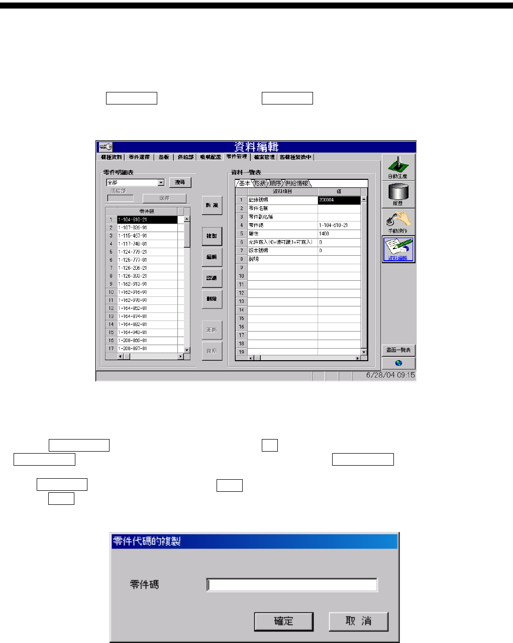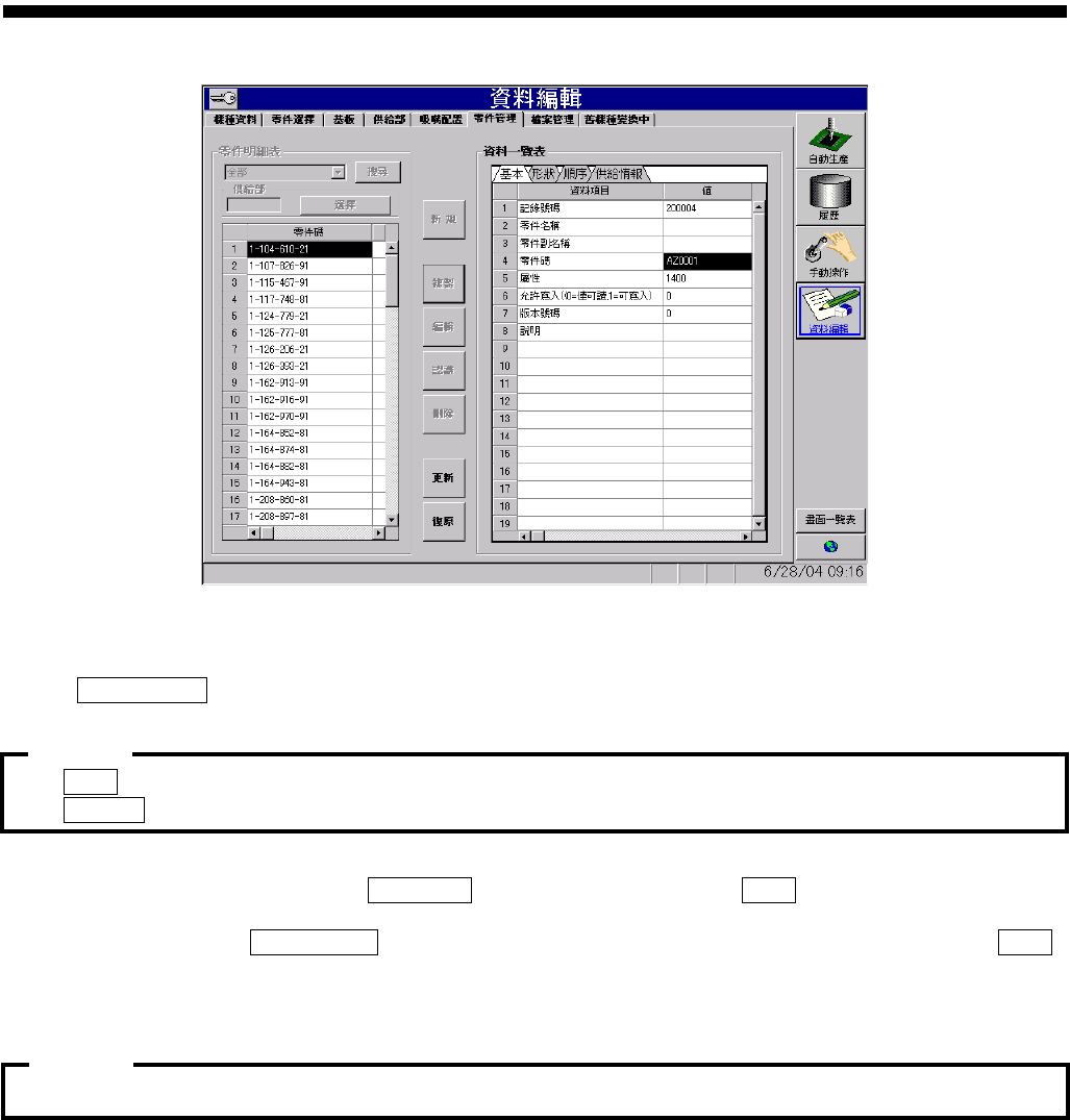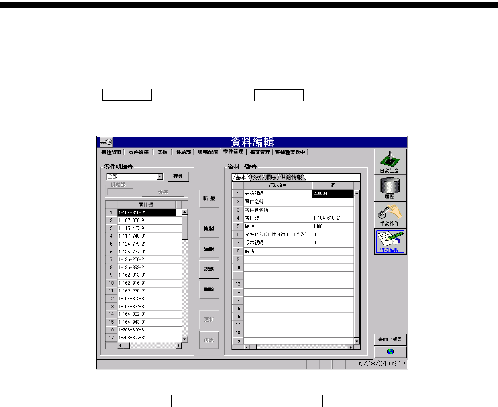 操作篇 6. 资料编集 SI-F130AI 6-9 图 6. 1.1-10 資料編輯- 零件管理 ( 资料编辑-零 件管理 ) 画面 資料一覽表 ( ) · 基本 ( 基本 ) 标签的记录 号码为自动登录号码 ,无必要修正。 · 零件碼 ( 零件码 ) 需要输入任 意的唯一号码。 , 零件管理 …