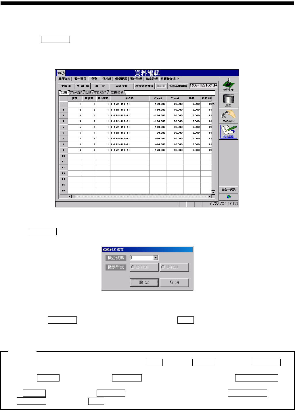 操作篇 6. 资料编集 SI-F130AI 6-83 (7) 机台号码的选择 [ 操作功能 ] [ 操作顺序 ] 图 6.4.5- 12 資料編輯—基 板 ( 资料编辑 -基板 ) 画面 機台號碼 ( ) …