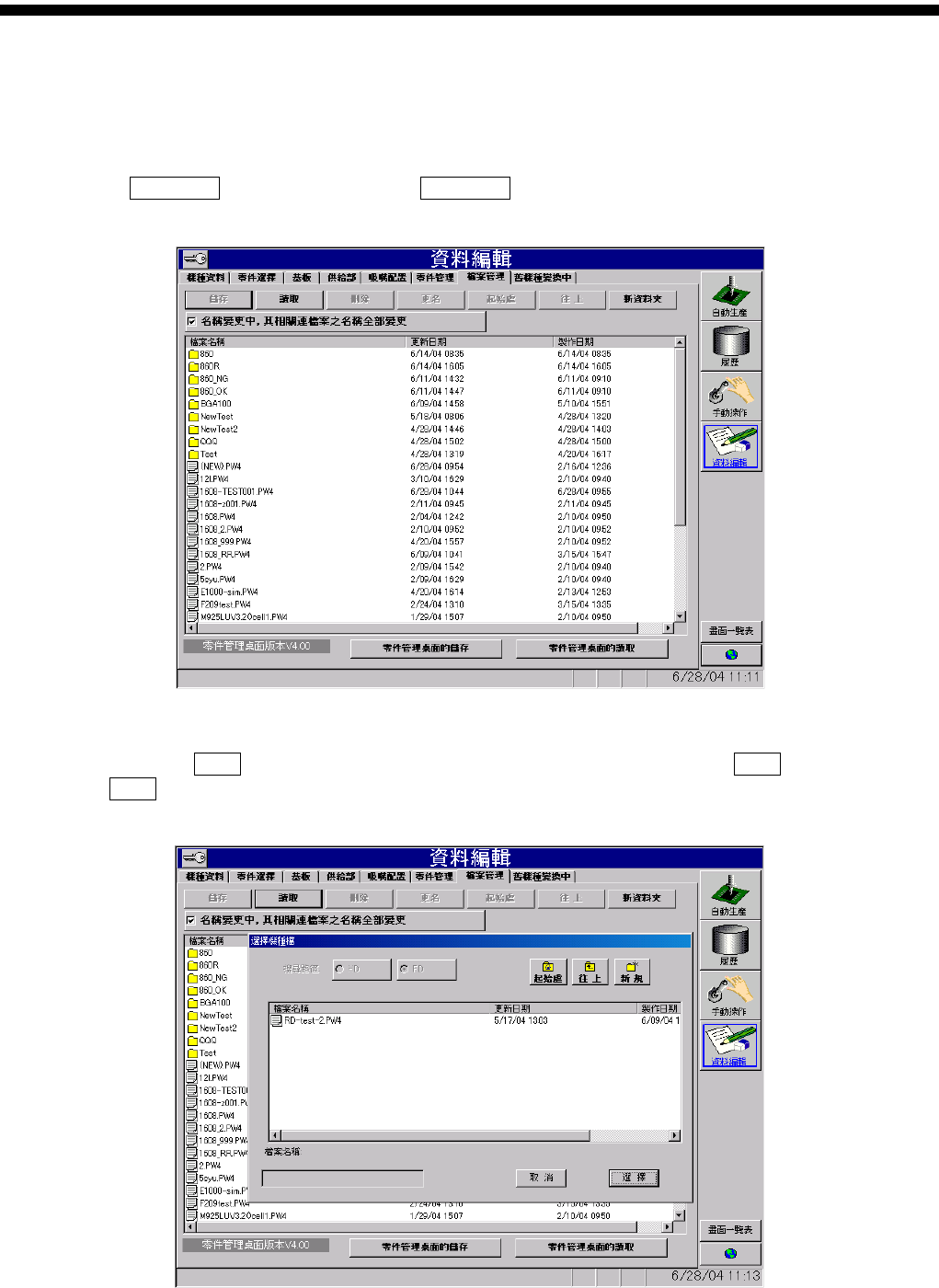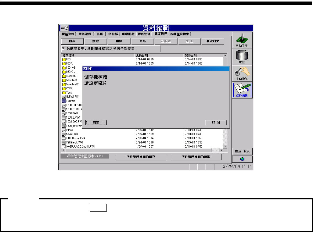 操作篇 6. 资料编集 SI-F130AI 6-10 1 图 6.7.1- 2 資料檔 ( 资料文件 ) 对话框 ·选择多个文 件时,按着 Ctrl 键的同时 选择文件。 ·机种文件的 储存中,会显示 「 機種 檔案儲存中 。」 ( 机种文件储存 中。 ) 信息对话框。 请不 要在存储 中取出 FD 。 注意 :
